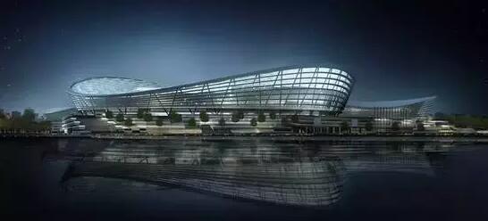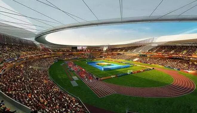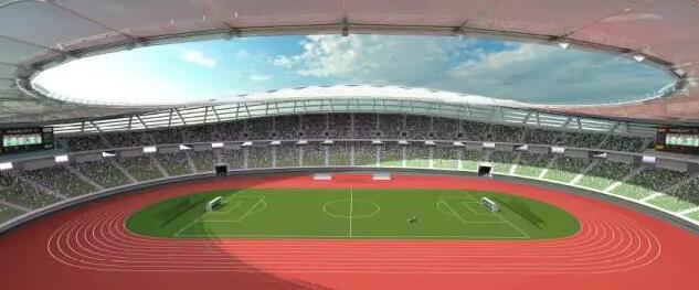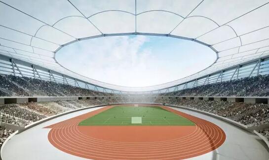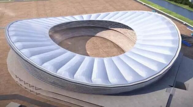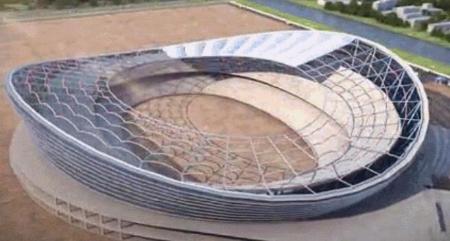 目前國內(nèi)采用單層索網(wǎng)結(jié)構(gòu)的場館跨度為100米左右,而園區(qū)體育中心體育場跨度達到了260米,為國內(nèi)最大跨度的單層索網(wǎng)結(jié)構(gòu)。該結(jié)構(gòu)為中間開孔的單層索網(wǎng)體系,設(shè)計思路來源于預(yù)張拉鋼條的自行車車輪,主要包括結(jié)構(gòu)柱、外壓環(huán)、徑向索以及內(nèi)環(huán)索,整個輪輻式索網(wǎng)屋蓋支撐在外圈傾斜的V型鋼柱上,形成了一個優(yōu)美的馬鞍型。體育場索網(wǎng)由40榀徑向索和內(nèi)側(cè)8根受拉環(huán)向索組成,全部索體均采用高標(biāo)準(zhǔn)的進口密閉鎖,在索網(wǎng)體系上安裝鋼拱并覆蓋張拉PTFE膜材形成膜屋面,膜屋面投影總面積約為31900平方米,最大膜單元面積為1200平方米。