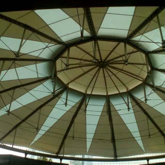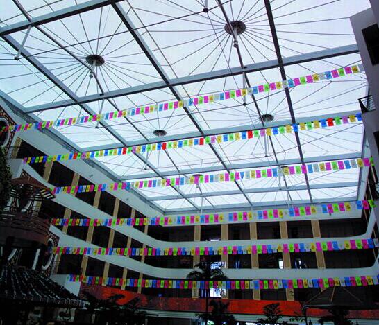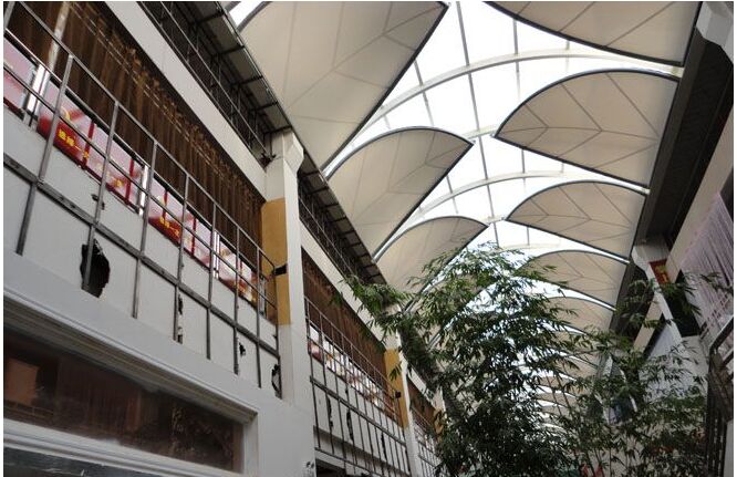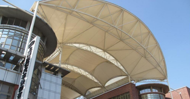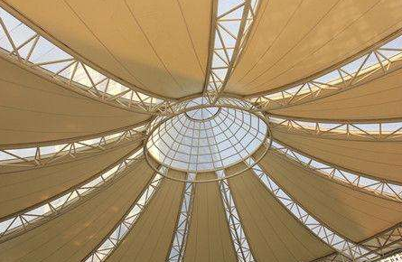 商業(yè)街的主要特點是因商業(yè)店鋪的集中而形成了室內(nèi)室外購物、休閑、餐飲等功能空間,步行街及中央活動區(qū)域是人們行走、休息、交流的開放空間,基于商業(yè)街特色,就決定了所有設計的核心就是讓空間更具人性化。中庭天蓬作為建筑附加設施,不僅要求遮陽避雨的實用功能,也應該是錦上添花的附件。膜結構發(fā)展數(shù)年來,應用于商業(yè)設施方面的工程案例在國內(nèi)已屢見不鮮,膜結構建造的天棚簡潔而大氣、柔美而剛勁、讓人們在休閑娛樂之時更加愜意。