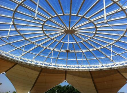 以建筑膜材作為屋面材料,具有高強度、耐腐蝕、自重輕、造型自由飄逸等優(yōu)異的特點,現(xiàn)在已經(jīng)成為很多屋面材料的首選,像鳥巢、水立方、上海世博會的很多場館都用到。屋面天蓬是建筑體量的一部分,其形式對建筑物的造型有很大影響,所以在選材及設計上也十分重要,膜結構輕巧別致極具現(xiàn)代化風格,且表現(xiàn)形式多樣易于安裝移動,在商業(yè)街設施建筑中將越來越重要。