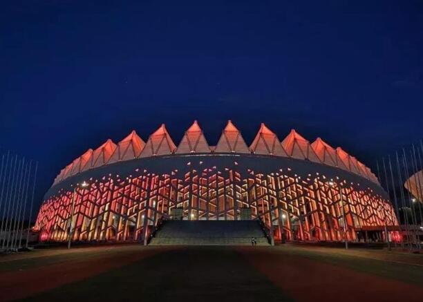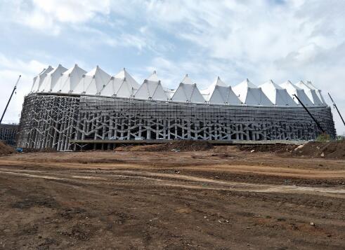 長春奧林匹克公園體育場采用獨特的輪輻式全張拉整體鋼索膜結構,總建筑面積為56186平方米,總座位數(shù)32200個,建筑結構高度為38.5米,罩棚桅桿頂高度為60米。結構平面投影近似圓形,其長軸方向長度為254.5米,短軸方向長度為249.2米。中心內環(huán)索為平面橢圓形,通過脊、谷索與圓形外環(huán)鋼結構桁架相連,立面呈馬鞍造型。脊索與谷索呈放射狀高低設置,并通過與高強度PTFE膜材的共同成型作用,形成波浪狀優(yōu)美的造型。