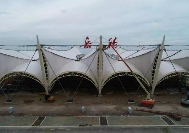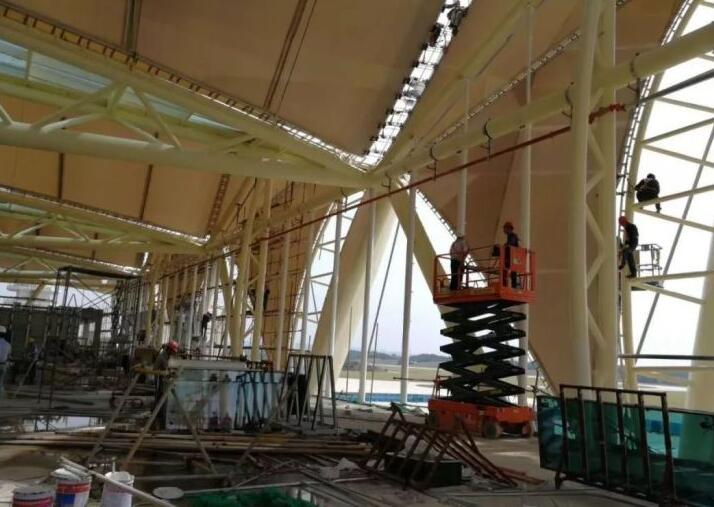 機(jī)場航站樓總面積近9000平米,整體采用國內(nèi)首創(chuàng)的鋼索膜結(jié)構(gòu)體系,用材和工藝都有嚴(yán)格要求,據(jù)悉,由于跨度大,重量達(dá)到45噸,然后膜結(jié)構(gòu)采用200噸的預(yù)拉張壓硬力,這種工藝精度要求高,施工難度大。鋼結(jié)構(gòu)拉索膜模擬船帆,鋼架、拉索形同桅桿,營造出“遠(yuǎn)浦歸帆”場景,展示出濃郁的岳陽地域文化特色。