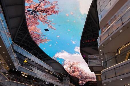 通過天幕屏,將人帶進奇思妙想的光影世界。吊裝在天花頂上的大型LED天幕屏宛如一條色彩艷麗的綢緞、明亮深邃的天空,再配合以新型LED燈條、燈帶、投影等照明設備,起到亮化、渲染作用。