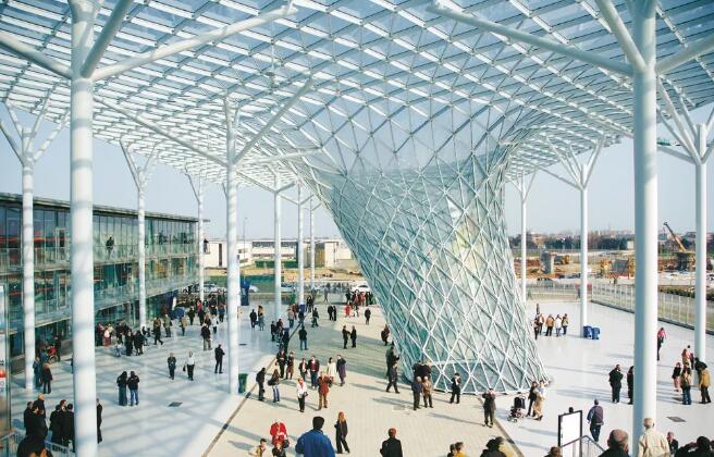以上各種天幕結(jié)構(gòu)均是支承在周邊建筑或樹形上的。除此以外,還有一種以天幕網(wǎng)格獨(dú)立或相對獨(dú)立支承的結(jié)構(gòu),其建筑形態(tài)往往呈現(xiàn)“喇叭形”。