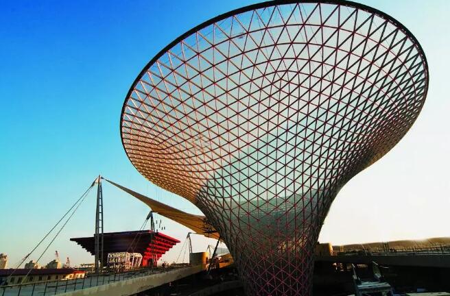 規(guī)則曲面的天幕一般采用鋼結(jié)構(gòu)網(wǎng)殼形式,利用網(wǎng)殼曲面的形抗原理,結(jié)構(gòu)以軸向受力為主、效率高,以較小的截面尺寸即可實(shí)現(xiàn)很大跨度。這一類網(wǎng)殼曲面多為圓柱面、球面。