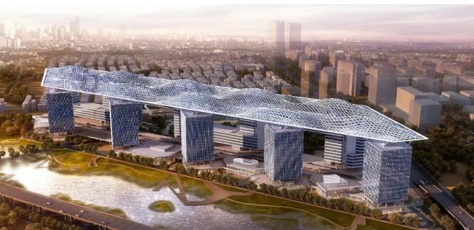 “云廊”平面尺寸長約730米、寬120米,波峰到波谷最大矢高16米。通過Y形外伸斜柱整體支承于由11棟間距50-100米的塔樓建筑群頂部,實(shí)現(xiàn)“如浮云一般連綿起伏”的形象,是一個(gè)超長、大跨的單層網(wǎng)格結(jié)構(gòu)。