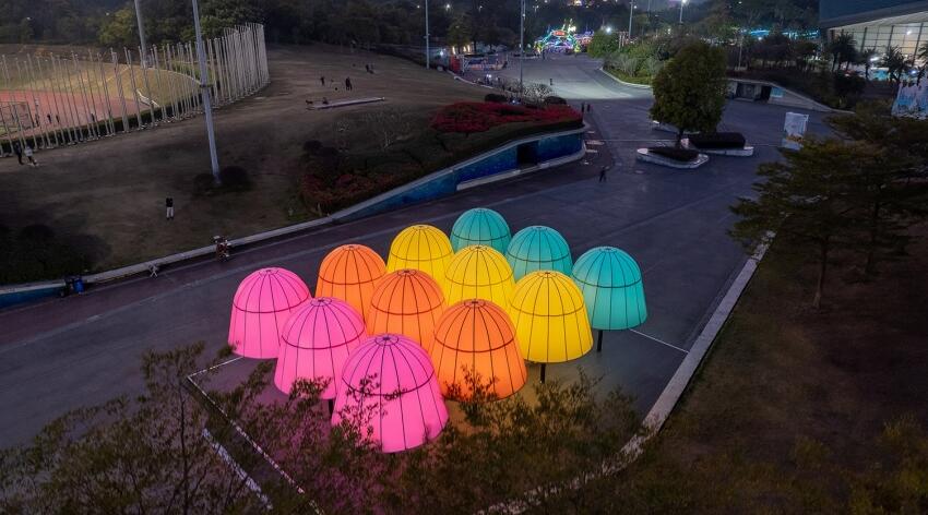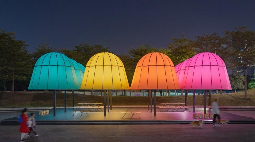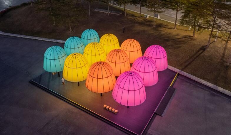 2021年深圳光影藝術(shù)季以“光遇未來(lái)”為總策展主題,希望光影藝術(shù)能融入城市生活,釋放城市公共空間的活力。“五色光亭”是位于龍崗展區(qū)大運(yùn)中心的建筑景觀裝置作品。