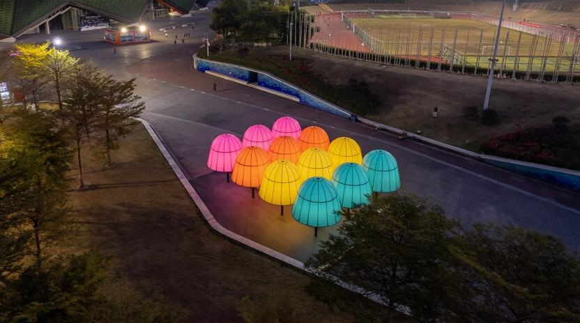 光亭從中國(guó)傳統(tǒng)燈籠的結(jié)構(gòu)中汲取造型靈感,分析了傳統(tǒng)竹編燈籠所采用的骨架結(jié)構(gòu),并采用了青綠、鵝黃、妃色、茜紅、墨黑這五種中國(guó)傳統(tǒng)色。設(shè)計(jì)出一個(gè)360度的開(kāi)放空間,12盞半圓形燈組成的彩色光矩陣于頂部輕輕籠罩。通過(guò)高差處理,將光亭的地臺(tái)與景觀草地自然地連接起來(lái),在景觀帶上休閑的市民可以很方便地到達(dá)亭子的內(nèi)部。