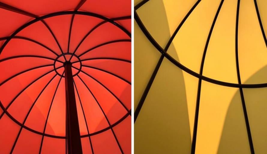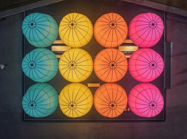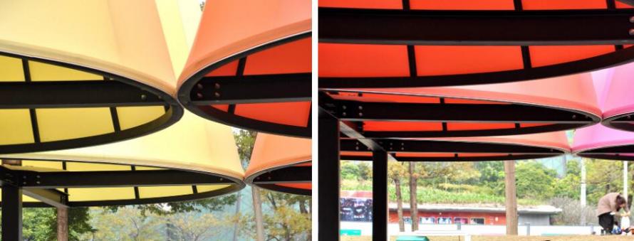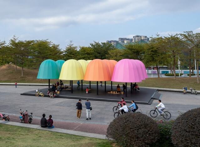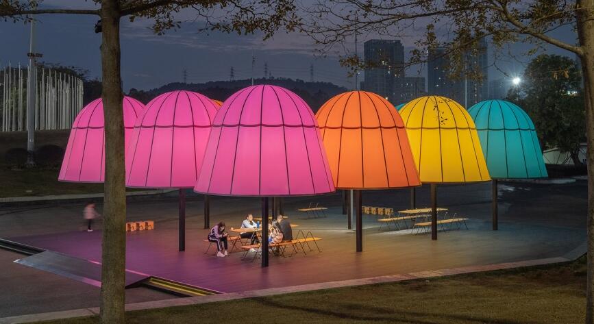 亭子穹頂部由彩色半透明的膜材料包裹,設(shè)計(jì)師希望材料能夠呈現(xiàn)類似紙張的質(zhì)感,光線可以穿透;其防水性也使亭子成為了雨天的臨時(shí)遮蔽場(chǎng)所。日間,透光材料遮蔽部分陽(yáng)光,保證了亭下空間的舒適性;而在夜晚,點(diǎn)亮后的光亭多彩且柔和,成為城市晚間絕佳的公共活動(dòng)空間。