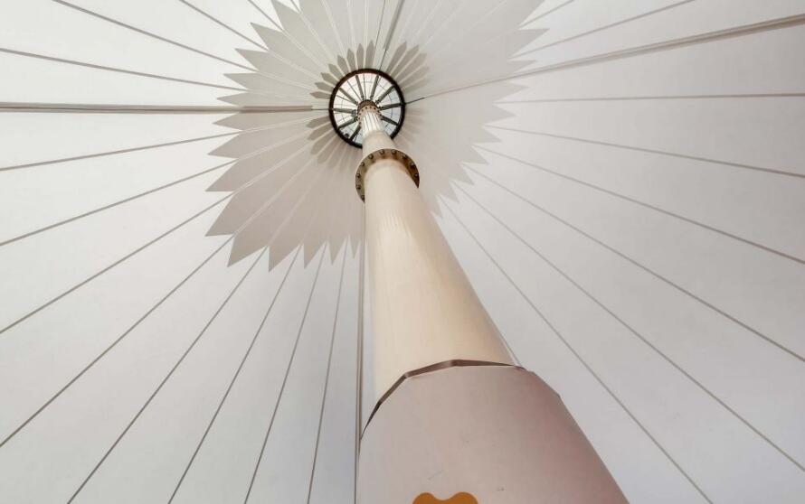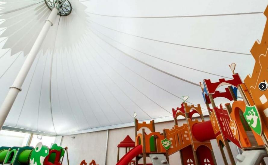 這是一個(gè)超450平米的兒童游樂場(chǎng),于上方覆蓋一把膜結(jié)構(gòu)“大傘",采用白色PVC膜材,大傘中央以一根鋼管支撐,營(yíng)造了一個(gè)明亮開闊無遮擋的空間。