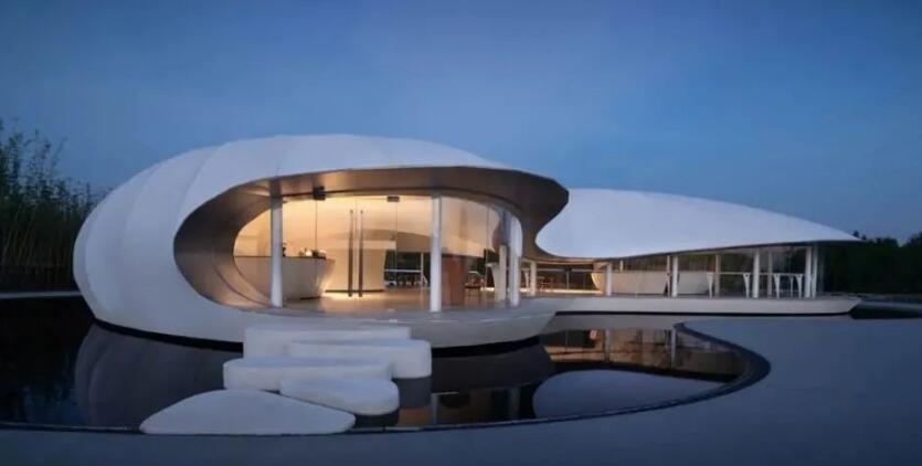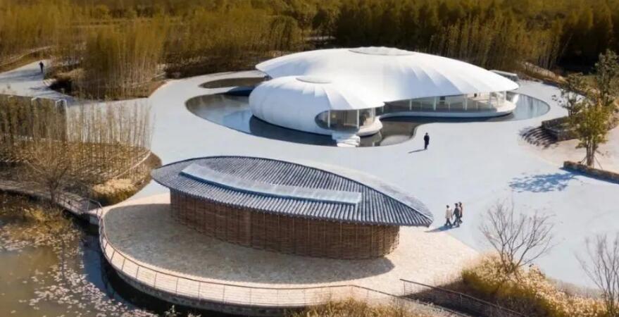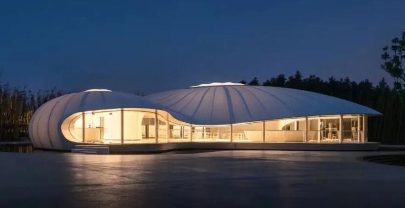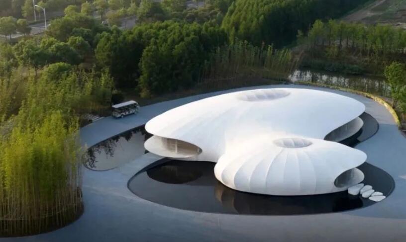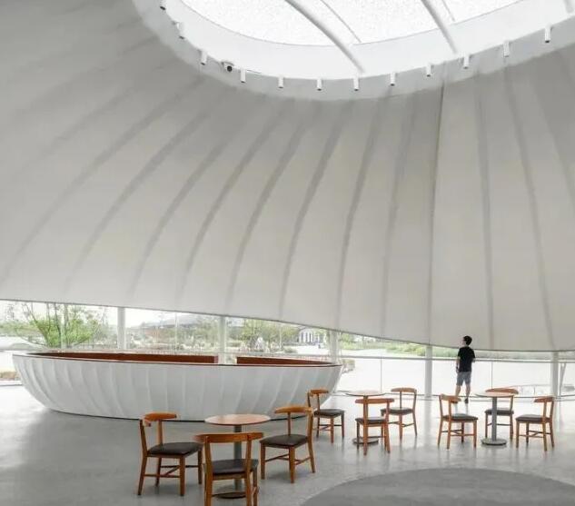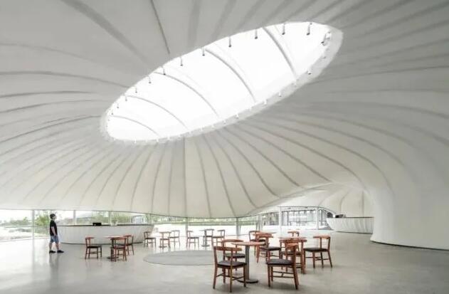 田園客廳展示中心采用膜結(jié)構(gòu)的設(shè)計(jì)語匯,純白的材質(zhì),天光的滲透,空間的彎曲,層次的分明,細(xì)膩的頂口高度控制讓整個(gè)空間和外部景觀既分又合。