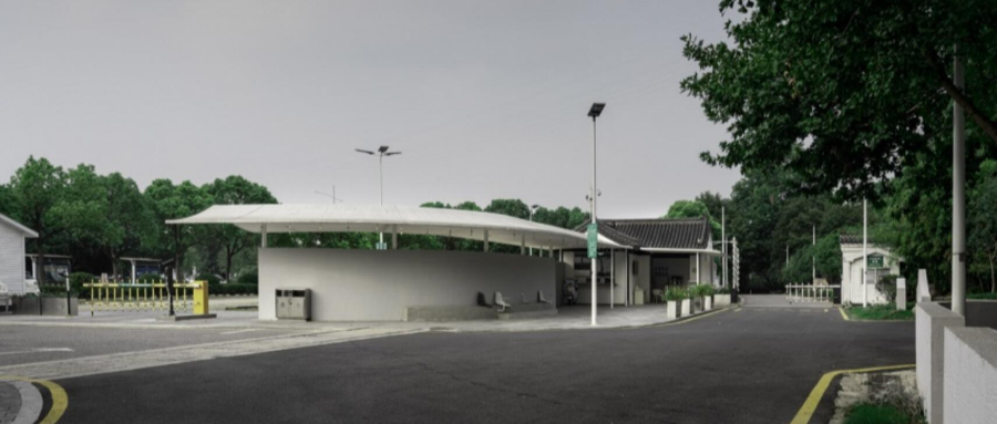 改造之前,由主入口進(jìn)入售票處不僅需要穿過(guò)馬路,也要走過(guò)遇到暴雨會(huì)積水的停車場(chǎng)。設(shè)計(jì)想通過(guò)“灰空間”的增加,優(yōu)化步行的體驗(yàn),同時(shí)也為入景區(qū)的游客,登山客提供一個(gè)可以休憩的場(chǎng)所。形式上借鑒了原有建筑人字坡屋頂?shù)男问?,讓新的?gòu)件成為原有建筑語(yǔ)言的延伸。