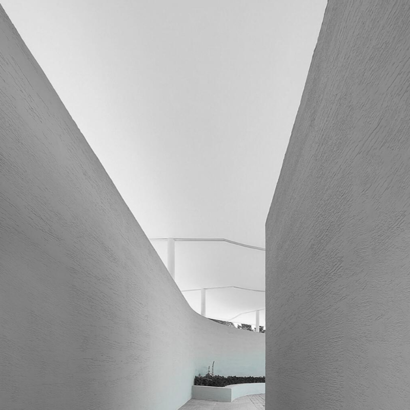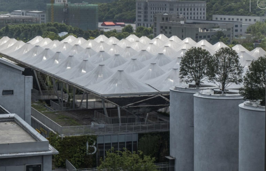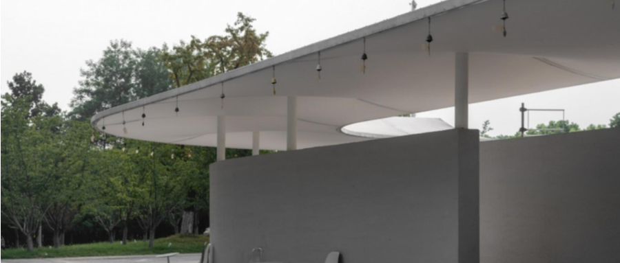 白色的張拉膜在山體的環(huán)境中尤為凸顯,人字形的擋土墻與圍合的院落,不僅呼應(yīng)了原有場(chǎng)地的形式,也大大減少了被暴雨沖刷的山體所流淌下來(lái)的泥沙。