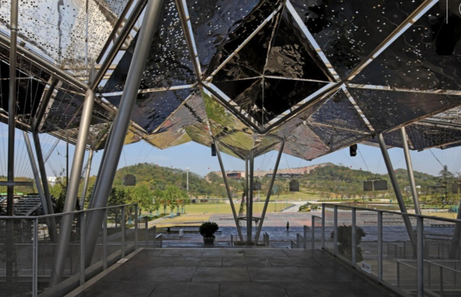 主展館是整個(gè)博覽會(huì)的核心建筑,如何在復(fù)雜的場(chǎng)地和建筑群體中,提供一個(gè)標(biāo)志性的公共集散、休息場(chǎng)所?我們利用原始廠區(qū)大門附近的一塊空地,建造一片梯田狀的景觀臺(tái)地,引導(dǎo)人流拾級(jí)而上,跨越高聳的擋土墻到達(dá)更高的臺(tái)地,臺(tái)地覆蓋之下是整個(gè)建筑群的設(shè)備能源機(jī)房。臺(tái)地之上,用束柱支撐起闊大的棚架,形成開(kāi)放空間。結(jié)構(gòu)柱分解成倒錐形的一束細(xì)柱,內(nèi)置錐形金屬網(wǎng),形成空間裝置,引導(dǎo)植物攀附。透光屋頂使用標(biāo)準(zhǔn)單元的傘狀膜結(jié)構(gòu),鏡面不銹鋼吊頂將臺(tái)地上的植物倒映在空中,好像一片幽靜的森林。不銹鋼葉片上的細(xì)碎的小孔,像樹(shù)葉、像蟲(chóng)噬,覆蓋著與臺(tái)階和大地融為一體的植物。