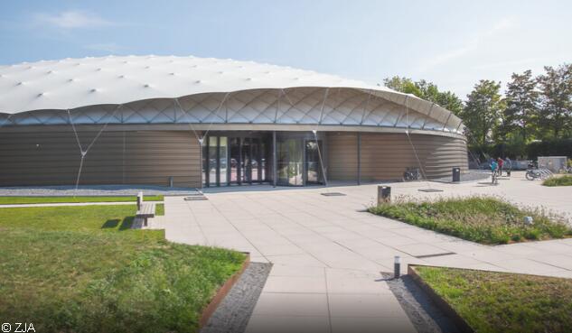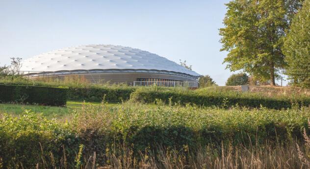 赫魯斯貝克 Shaded Dome 的外形是一個被拉長的穹頂,由輕型織物構(gòu)成,隱喻在市場花園行動中布滿天空的降落傘。建筑坐落在一個平坦的山頂上,略微向山谷傾斜,同時在該方向上削減體量,形成醒目的入口空間。辦公室和倉庫位于地下,上部空間留給餐廳,在這里可以遠(yuǎn)眺山谷——當(dāng)年盟軍各師就是從這里開始向德國進(jìn)發(fā)。