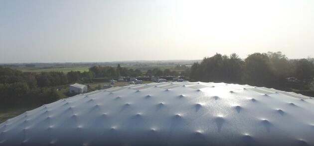 當(dāng)屋頂充氣時,自動對準(zhǔn)的撐桿就會豎起來,在它們之間形成一個空腔,加快空氣流通,并自然而然帶走太陽輻射產(chǎn)生的熱量。相比于傳統(tǒng)膜結(jié)構(gòu),Shaded Dome 這種雙層織物加 50 厘米空腔的結(jié)構(gòu),能夠用更少的能耗創(chuàng)造健康舒適的室內(nèi)環(huán)境。
