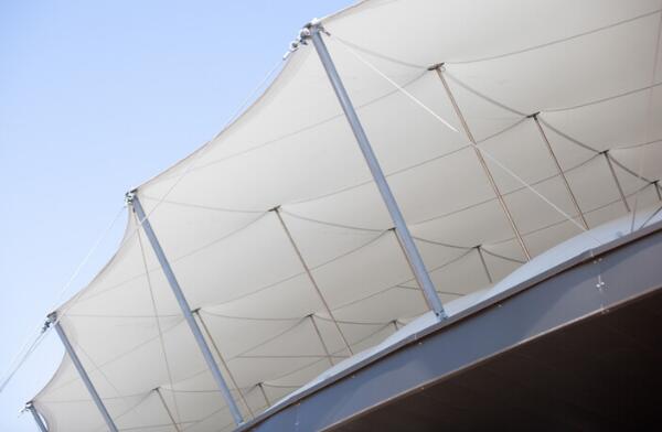 Shaded Dome被安裝在一個混凝土的基座上,內(nèi)部開有門窗洞口,它包括一個由氣壓支撐的穹頂,一個鋼索網(wǎng),以及一個大跨度的高科技織物屋頂。穹頂內(nèi)外的織物被分隔構(gòu)件隔開,相互絕緣。