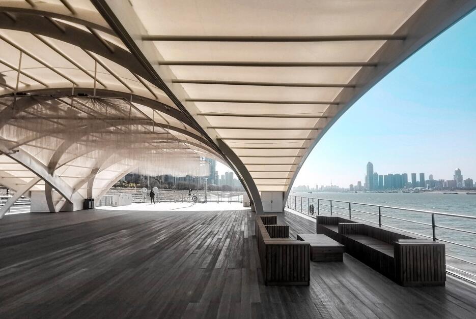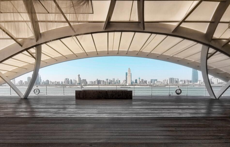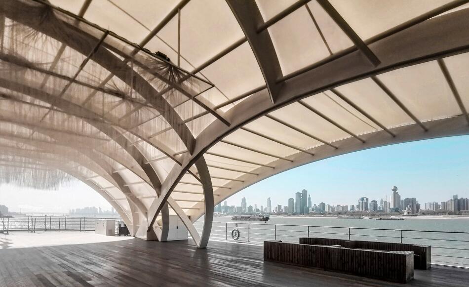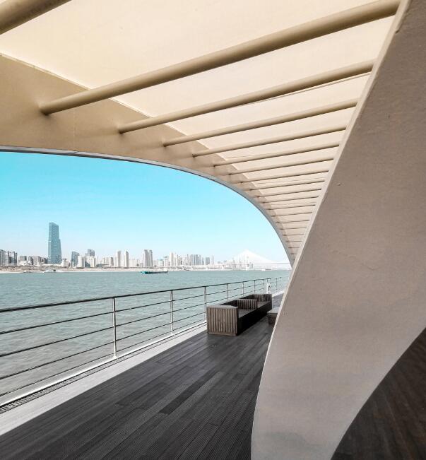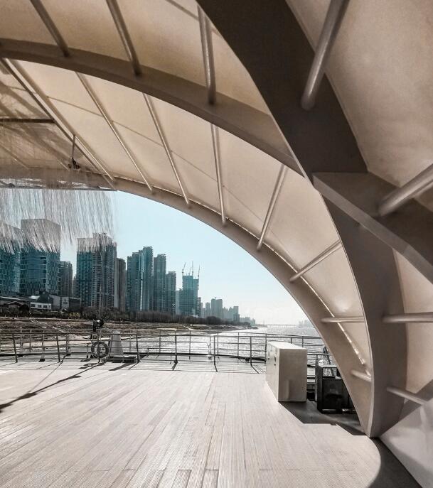 由于船身受限于功能與技術上的基本需求,設計方將造型重點放在了頂層遮陽棚上。其形式由十字拱發(fā)展而來,一方面在長軸上形成用于舉辦婚禮儀式的紀念性空間,一方面獲得四面框景,在船行過程中,不斷裁剪兩江四岸的景致。