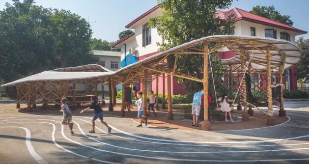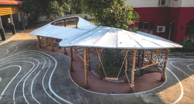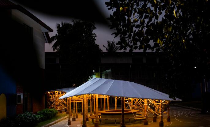 整個(gè)結(jié)構(gòu)由竹子和膜布建成,龍竹(Dendrocalamus giganteus )用于框架,銳藥竹(Oxytenanthera albocialiata Munro)用于弧形元素,而支撐和屋頂梁則采用泰竹(Thysostachys siamensis ), 屋頂覆蓋白色膜布,在∞形狀的兩個(gè)開(kāi)口內(nèi)是場(chǎng)地的既有樹(shù)木和座位空間,供教師休息的同時(shí)能夠隨時(shí)視察孩子們的情況。