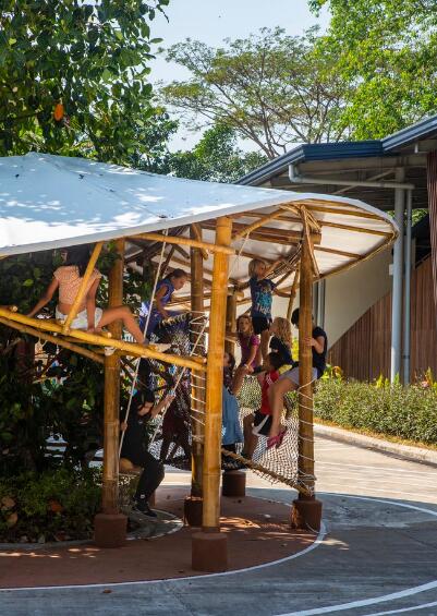 沒(méi)有任何游戲設(shè)施的游樂(lè)場(chǎng)最初坐落在一塊光禿禿的大型混凝土地板上。該項(xiàng)目圍繞場(chǎng)地上現(xiàn)有的兩棵樹(shù)編織成一個(gè)無(wú)限符號(hào)∞的結(jié)構(gòu)。在這個(gè)結(jié)構(gòu)下設(shè)有一系列游戲:先是竹竿攀爬、魚(yú)網(wǎng)攀爬、過(guò)云梯、坐秋千,最后是緬甸式跳格子,依次重復(fù)進(jìn)行。這些游戲結(jié)合起來(lái)創(chuàng)造了一個(gè)無(wú)限長(zhǎng)的障礙賽跑道。