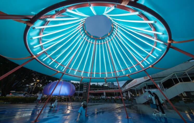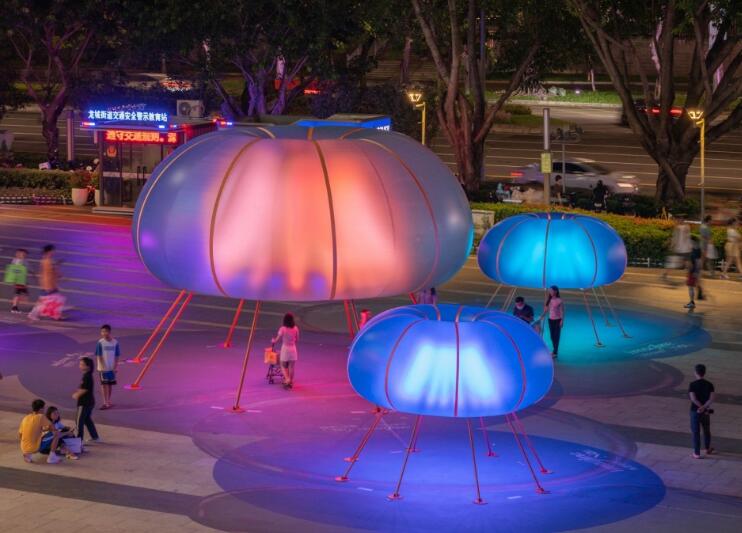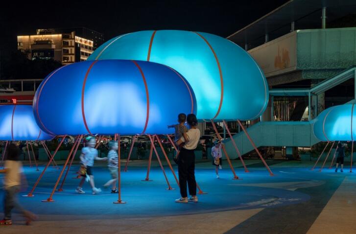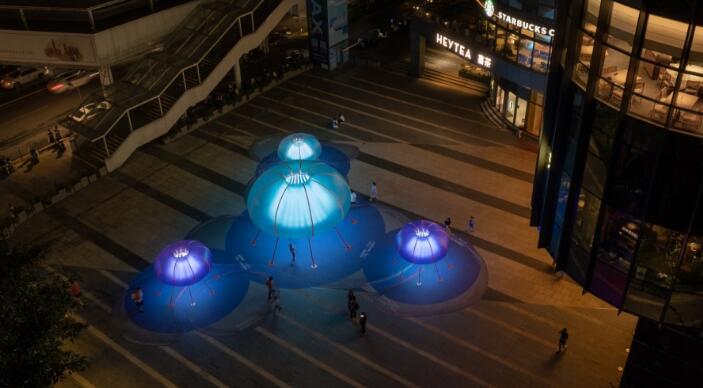裝置的核心結(jié)構(gòu)是一座直徑7米、高5.5米的大型光亭,構(gòu)成地標(biāo)式的視覺焦點。這座光亭提供了可仰望觀看的尺度,仿若深海中的巨型水母,使人們在光影間充分沉浸于幻想的世界,置于其中的聲音裝置也從聽覺層面疊加了更為豐富的體驗。