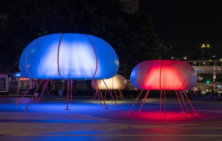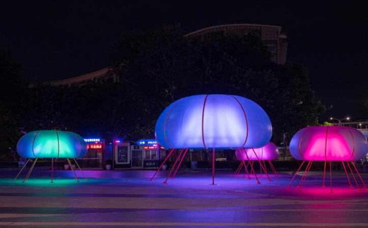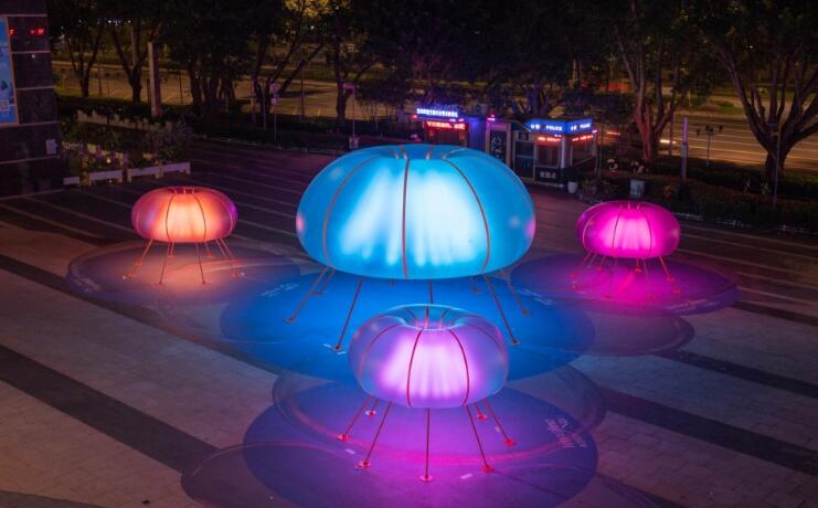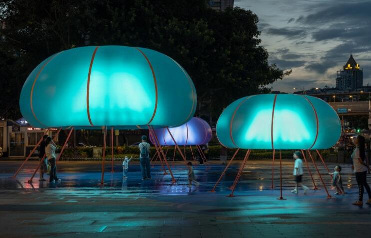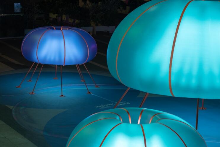 “光之浮想”的創(chuàng)作靈感來自遠(yuǎn)古時期就已存在的海洋浮游生物——水母。受水母輕盈的傘狀形態(tài)及豐富色彩的啟發(fā),作品將目光投向“浮想”的自由空間與“光”的超現(xiàn)實體驗。