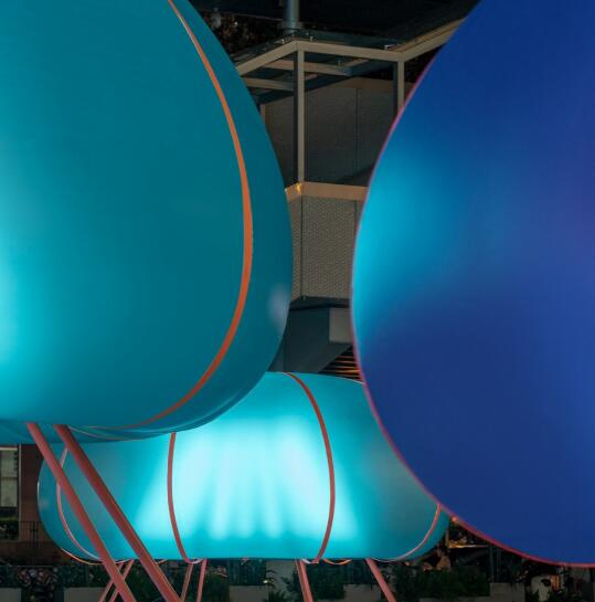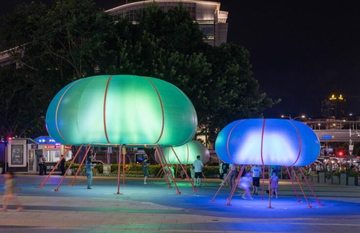 裝置表面的氣膜隨自然有機(jī)體而賦彩,綠色、紫色及鵝黃柔軟悅目,其中容納的編程燈光采用全色域RGB燈具,色彩隨時間緩慢變幻,“呼吸”的頻率設(shè)為每六秒一次,讓人類的呼吸與深海中水母浮游的節(jié)奏同頻,帶來充滿生機(jī)的特別感受。