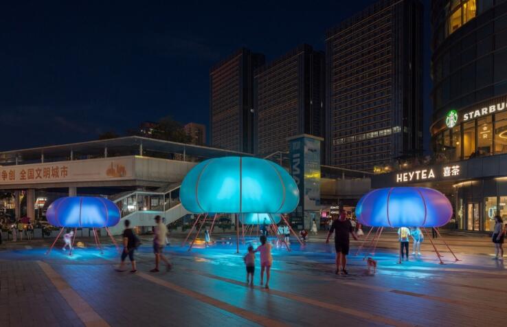 該空間藝術(shù)裝置“光之浮想”位于深圳龍崗萬科廣場。錯落有致的光亭矩陣點亮夜晚的廣場,為城市和社區(qū)帶來充滿幻想色彩和創(chuàng)造力的場景體驗,將日??臻g轉(zhuǎn)變?yōu)槌休d情感與活力的公共場所。
