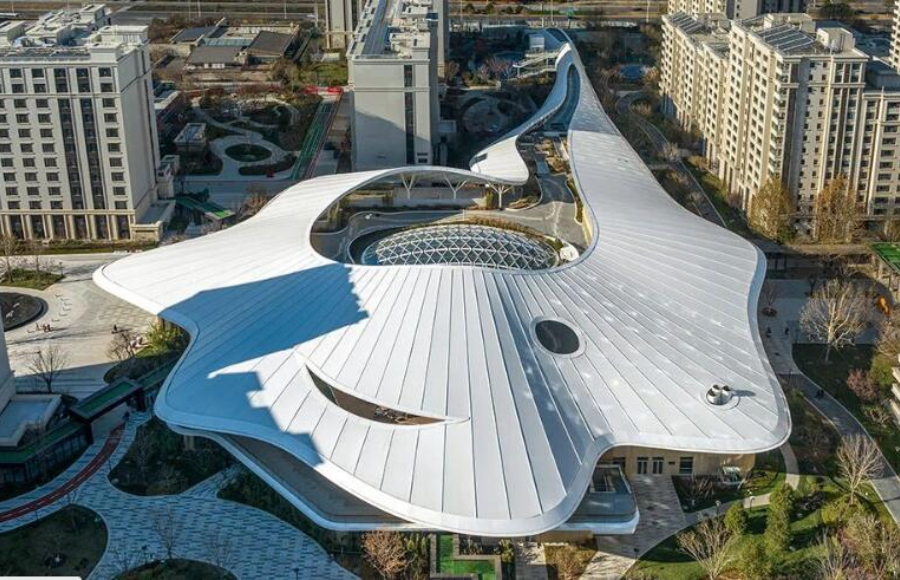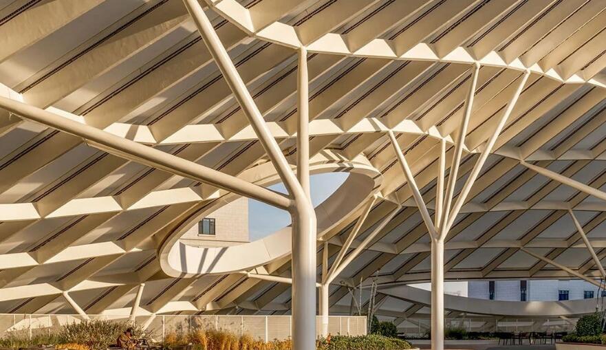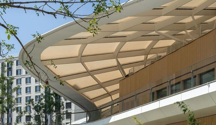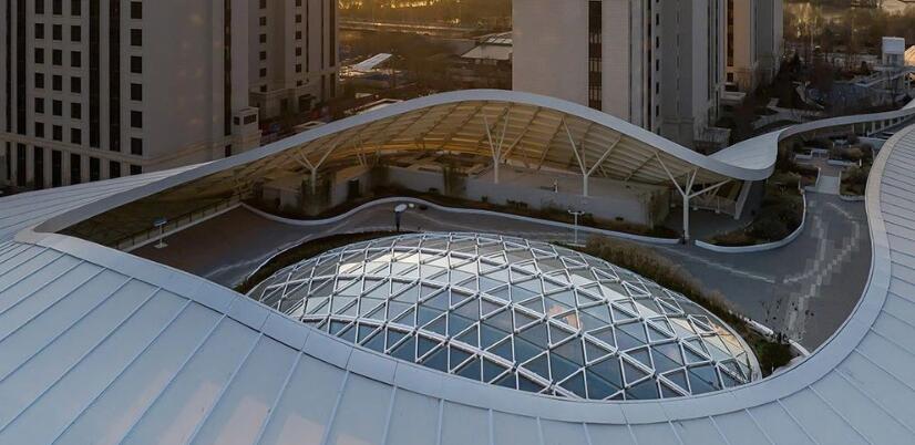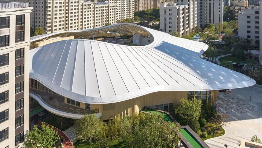 建筑采用整體輕盈的異形曲面屋PTFE膜結(jié)構(gòu)屋頂,猶如漂浮于地面的云朵。入口處采兩層通高的玻璃幕墻,將自然景觀引入室內(nèi),并提供良好的自然光線。實(shí)體墻面部分采用金屬幕墻豎向分割構(gòu)造出豐富的細(xì)節(jié)。
