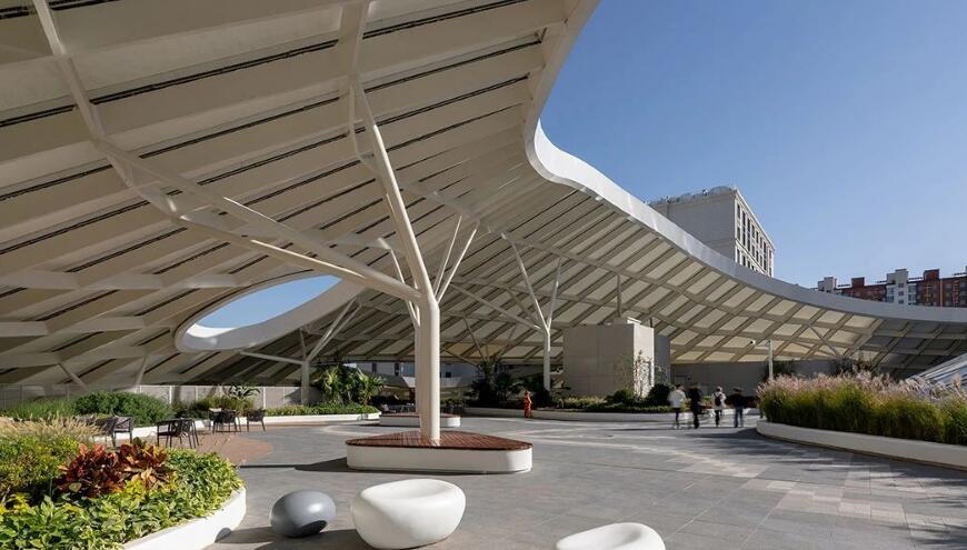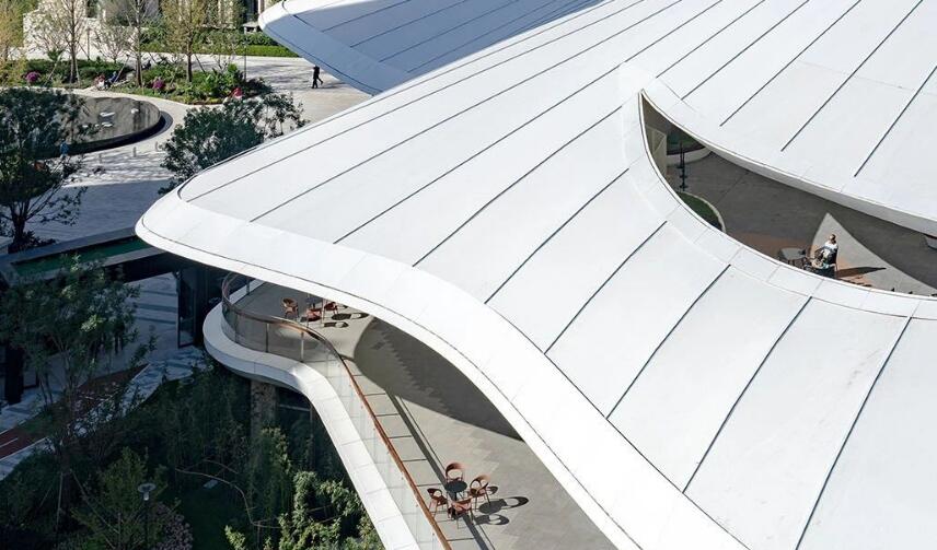 相對(duì)于四周規(guī)則的建筑形態(tài),活力中心呈現(xiàn)更加自由和充滿活力的有機(jī)形態(tài)。如一顆水珠滴落,在場(chǎng)地中激起漣漪,自中心散開、升騰,形成一片白色、柔軟的云朵,最終轉(zhuǎn)化為自由的大屋頂。