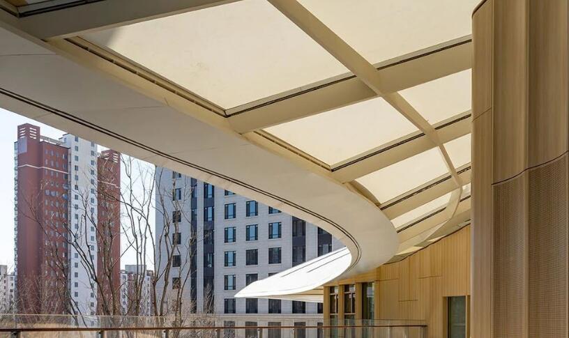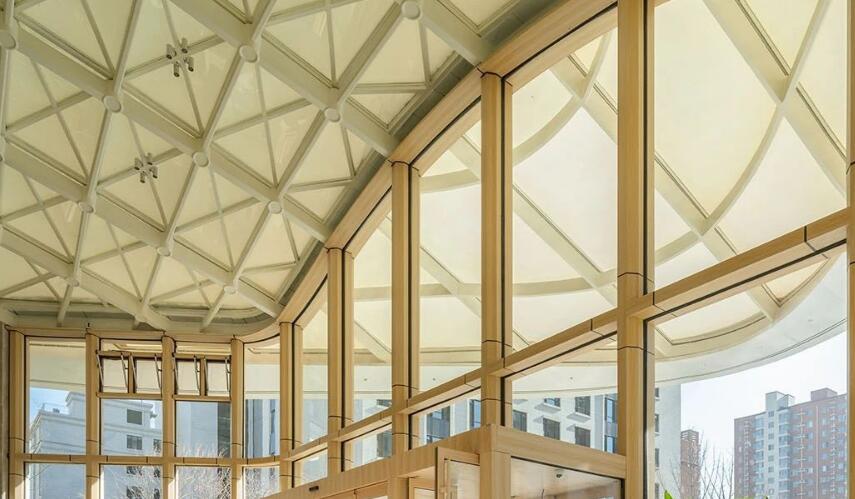 為強(qiáng)調(diào)建筑給人以溫暖、輕盈與柔軟的感受,建筑立面和室內(nèi)均已木色為主,木材天然的質(zhì)感更容易與人產(chǎn)生情感的共鳴。木色結(jié)構(gòu)框架富有節(jié)奏感的線條,在白色PEFE膜的襯托下,賦予建筑從容又典雅的生命力。