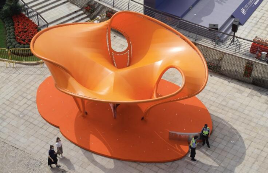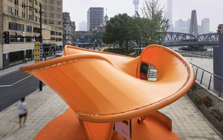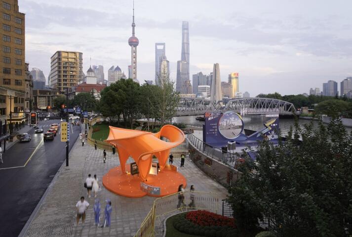 展亭坐落于上海北外灘濱江,名海泰展亭,是零幾建筑為2023年上海賽艇公開(kāi)賽設(shè)計(jì)的品牌展亭。在賽艇比賽中,船槳沖擊水面形成漩渦,而后逐漸消散,繼而變化出新的漩渦,這是展亭設(shè)計(jì)的靈感來(lái)源。建筑師用計(jì)算機(jī)算法生成了三個(gè)莫比烏斯環(huán),以構(gòu)成展亭的形態(tài)。每個(gè)莫比烏斯帶代表運(yùn)動(dòng)員追求卓越的個(gè)體力量,三個(gè)莫比烏斯帶互為起承,合為一體,抽象的漩渦誕生了濱江岸一處人工景觀。