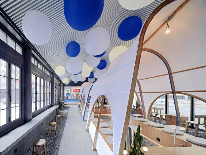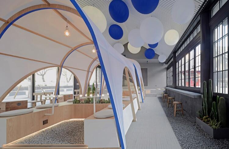 咖啡館位于蒙藏學(xué)校舊址入口南面,是西單北大街上蒙藏學(xué)校舊址傳統(tǒng)建筑群的一部分??Х瑞^來源于帳篷的靈感,希望能在室內(nèi)營造戶外公園般的輕松氛圍,在一個(gè)單一的狹長空間里,用一種輕盈的方式重新定義空間。
