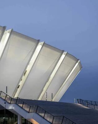 屋面結(jié)構(gòu)由36根細(xì)絲懸臂鋼梁支撐。上弦桿是混凝土雙墻在屋面層的延伸,桿上覆蓋有膜材,形成鮮明的折疊,沿外立面向屋面結(jié)構(gòu)延伸。日間,膜材提供了遮陽擋雨的作用;夜幕降臨時(shí),場(chǎng)館內(nèi)部的照明穿透半透明膜材,彌漫出柔和的光。這樣膜材不僅能打造場(chǎng)館的外觀照明效果,還能將光線反射至場(chǎng)內(nèi),為看臺(tái)區(qū)域提供均勻舒適的照明。
