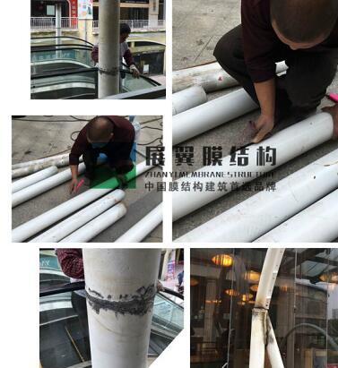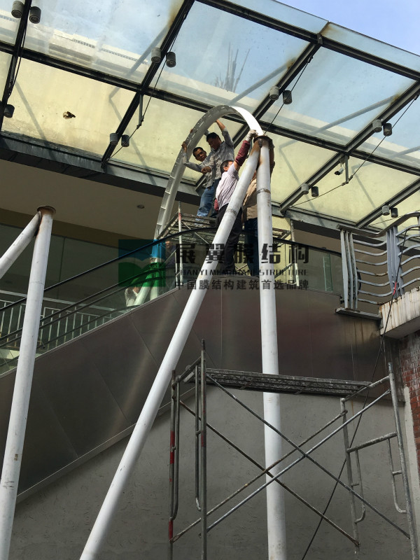江西贛州萬(wàn)盛廣場(chǎng)電梯膜結(jié)構(gòu)雨棚工程近日正在施工,鋼結(jié)構(gòu)加工完畢后進(jìn)入安裝工序,之后將是膜材的覆蓋工作,下面是現(xiàn)場(chǎng)施工圖: