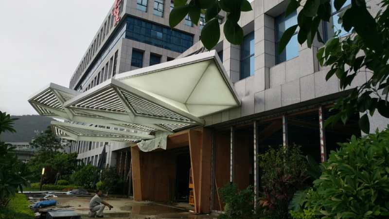 珠海保稅區(qū)大門膜結(jié)構(gòu)雨棚工程正在施工,雨棚造型為不規(guī)則幾何形狀,搭配高透光膜材,顯得時(shí)尚雅致。