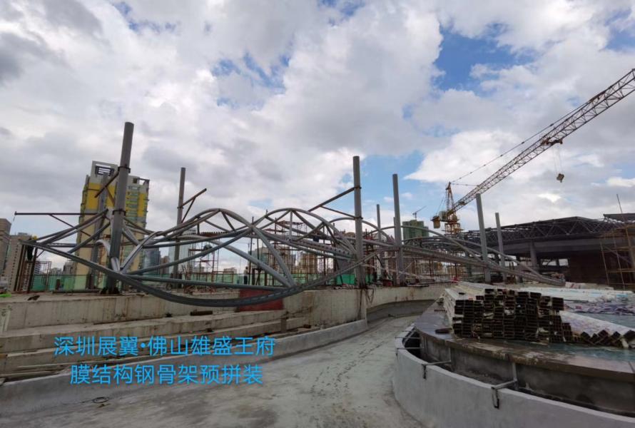 公司承建的佛山雄盛王府張拉膜結(jié)構(gòu)屋頂工程進(jìn)入施工階段,現(xiàn)進(jìn)行鋼骨架預(yù)拼裝工序,鋼骨架完成后將進(jìn)行膜材的覆蓋。
