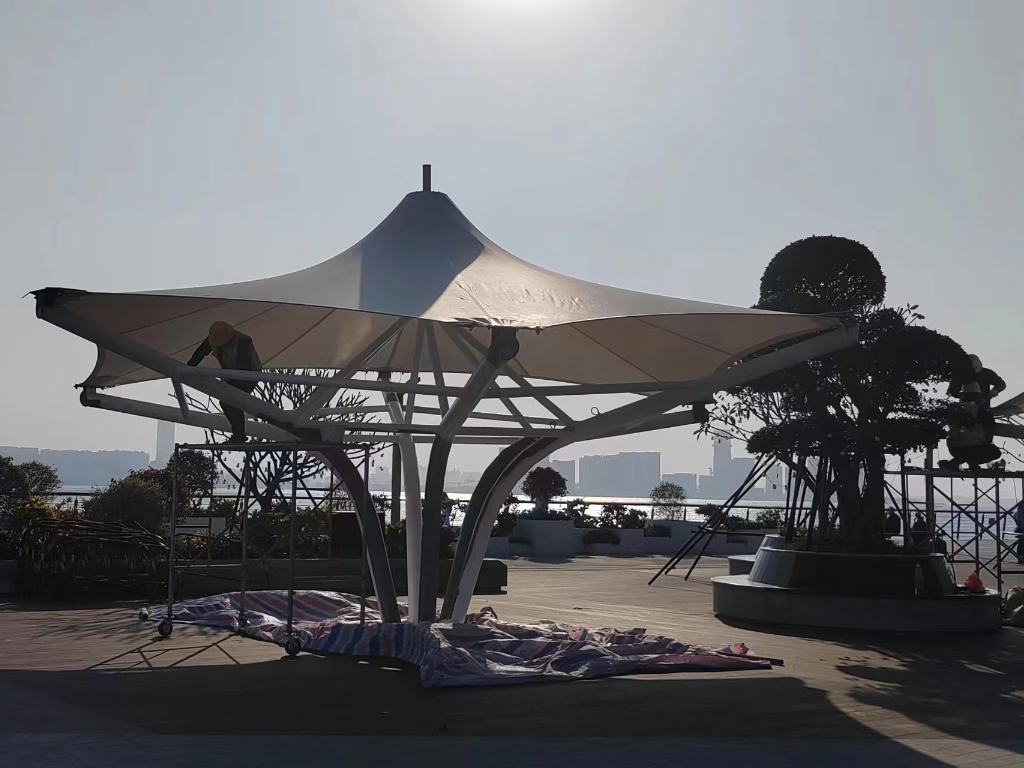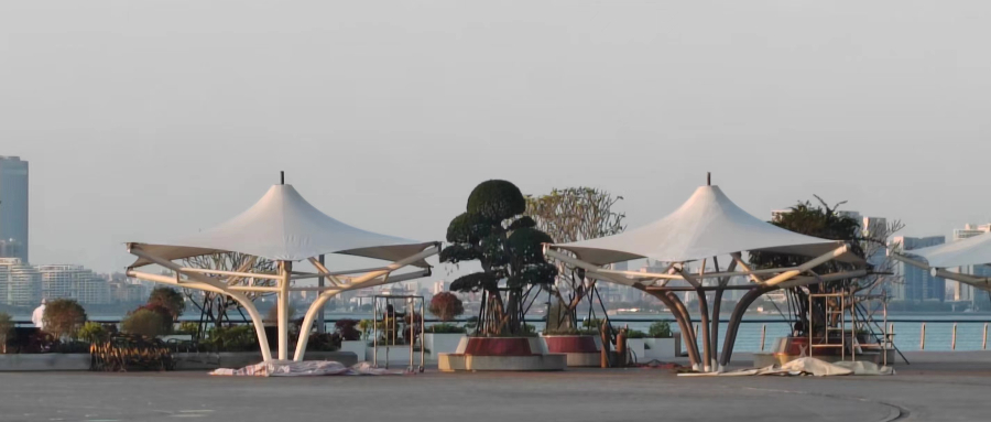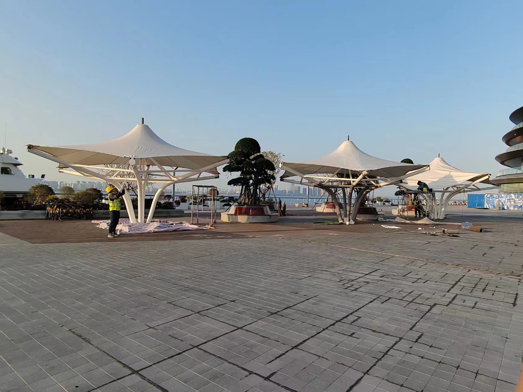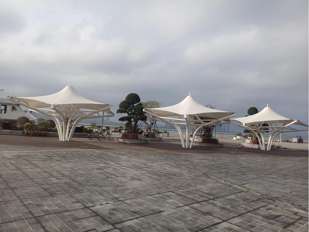 ??跒硰V場景觀張拉膜結(jié)構(gòu)工程近日基本完工,膜材已覆蓋完畢,三組體量的涼亭立于海邊廣場,既是遮陽避雨設(shè)施,又是與環(huán)境契合完美的景觀裝置。