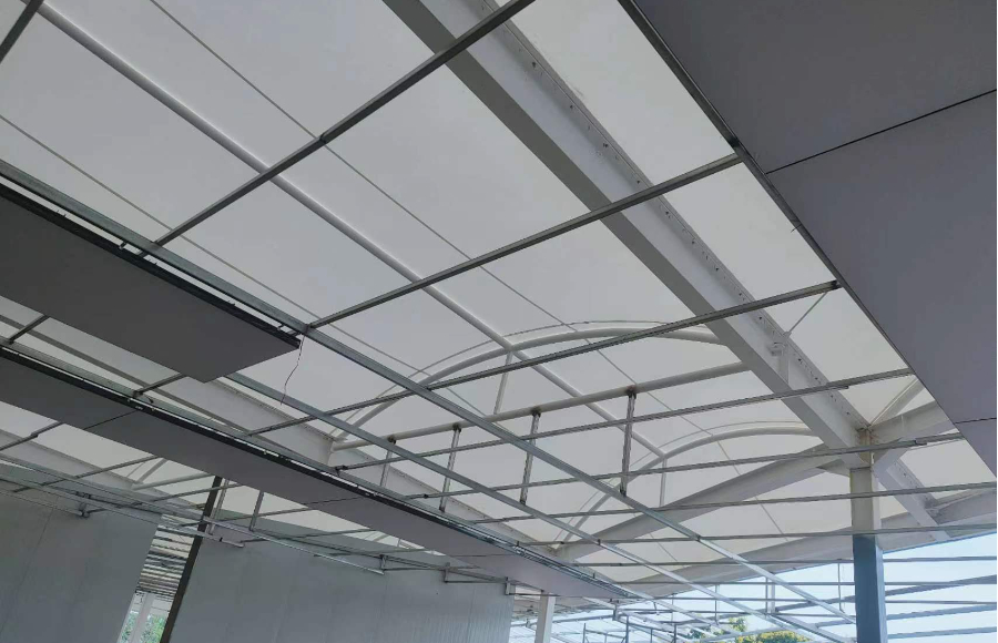 成都市雙流區(qū)二手車市場張拉膜結(jié)構(gòu)大棚工程正在施工,現(xiàn)場看到錯落有致的鋼構(gòu)上方膜材已覆蓋張拉成形,高低起伏的拱形屋頂顯得美觀又時尚,底下空間敞亮,整個結(jié)構(gòu)穩(wěn)固而結(jié)實。