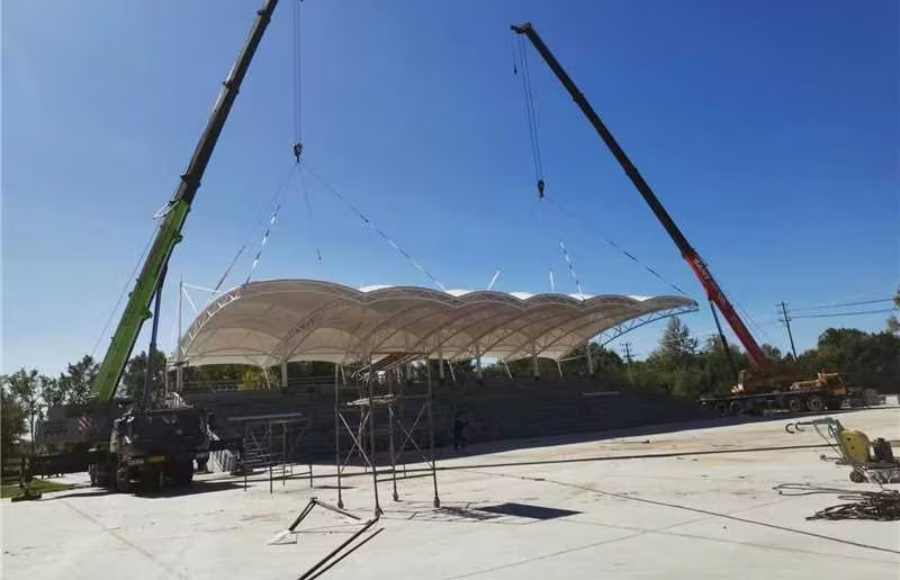 黑龍江鐵力體育場看臺膜結(jié)構(gòu)工程施工中,目前正進(jìn)行看臺罩棚鋼膜結(jié)構(gòu)的吊裝工作,不日將完工。