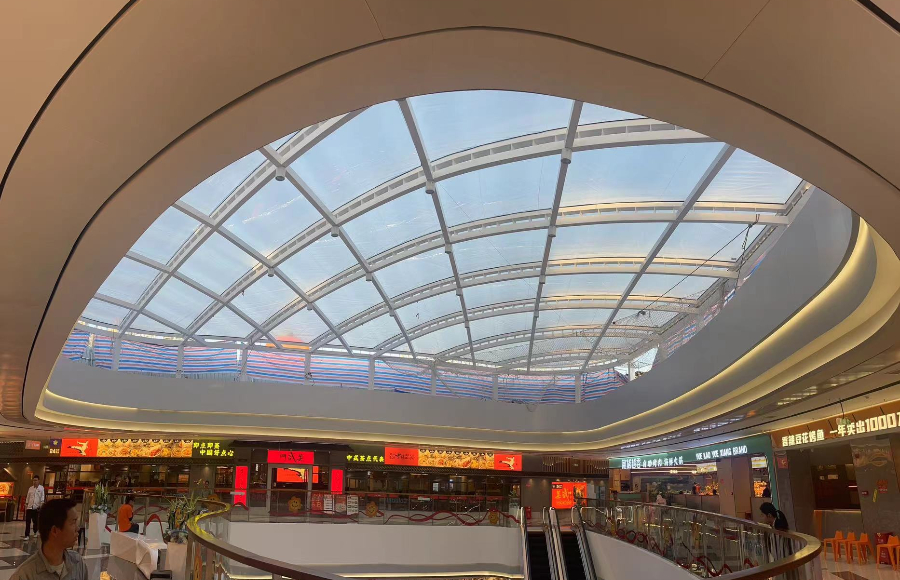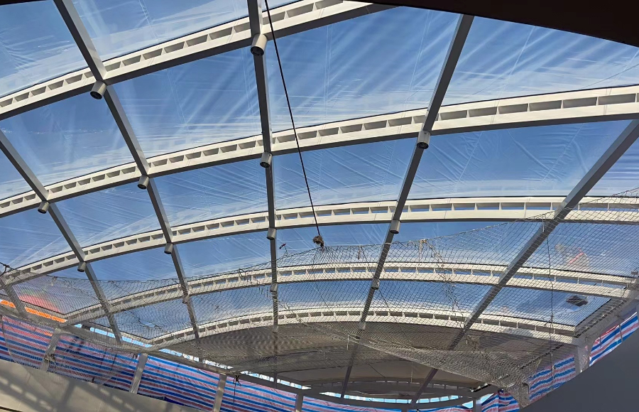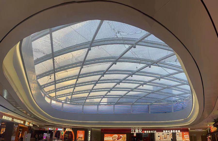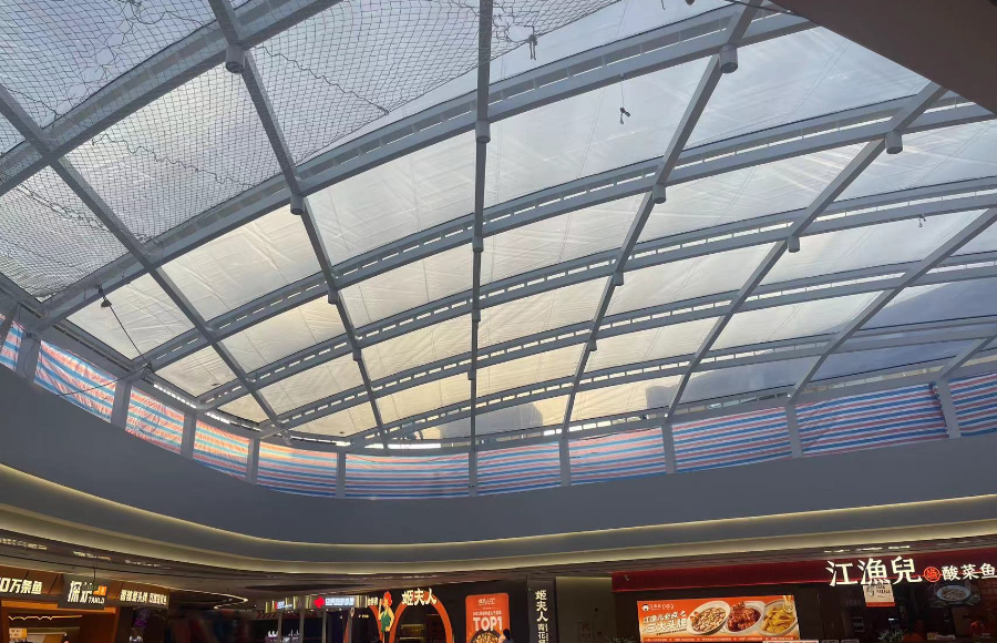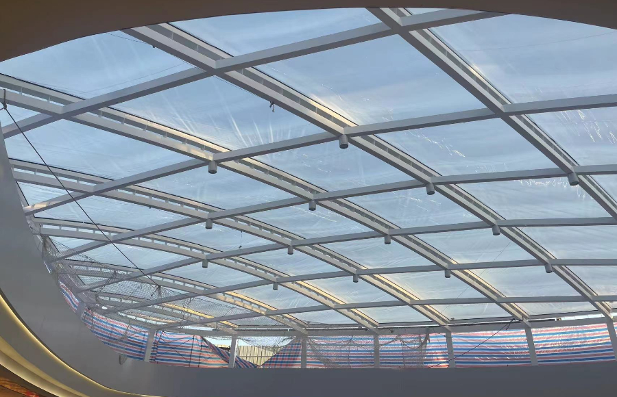 清遠(yuǎn)鴻豐繽紛天地中庭膜結(jié)構(gòu)屋頂項(xiàng)目施工進(jìn)入尾聲,從下往上看,鋼材縱橫交錯(cuò)組成整個(gè)屋頂?shù)闹谓Y(jié)構(gòu),上面覆蓋透明的ETFE膜材,呈現(xiàn)出一個(gè)高度透明、視覺(jué)壯觀(guān)的中庭屋頂,提供了最大的透光性、天氣保護(hù)和隔音舒適度。