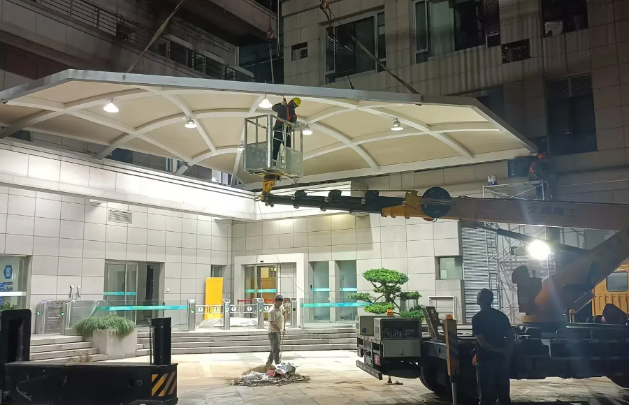 杭州電信大廈張拉膜結構頂棚工程正在進行施工,目前已完成頂棚的吊裝工作。