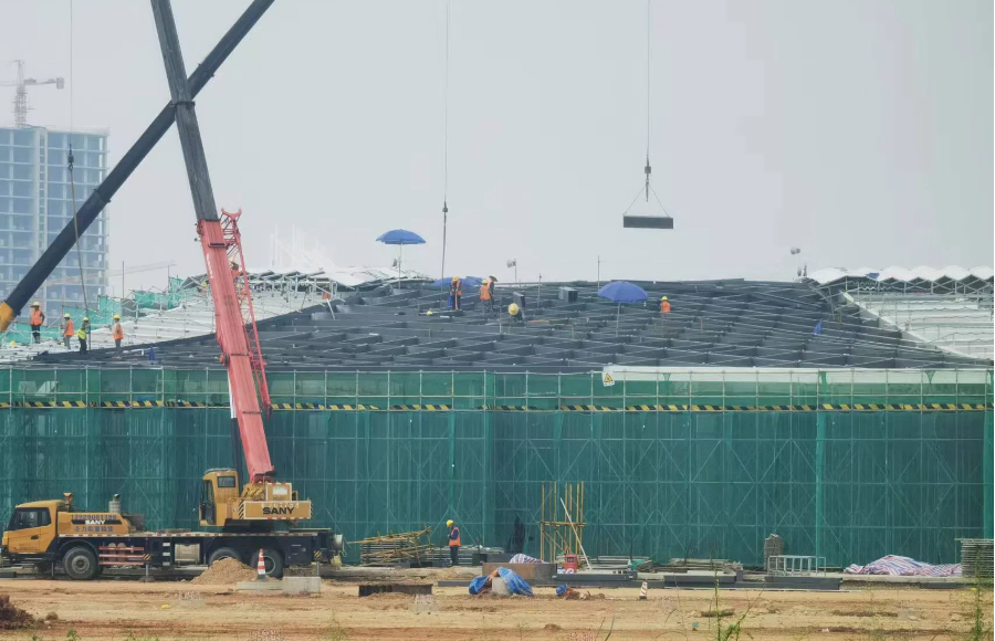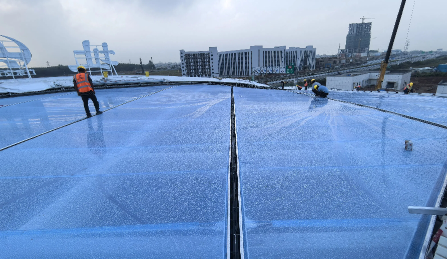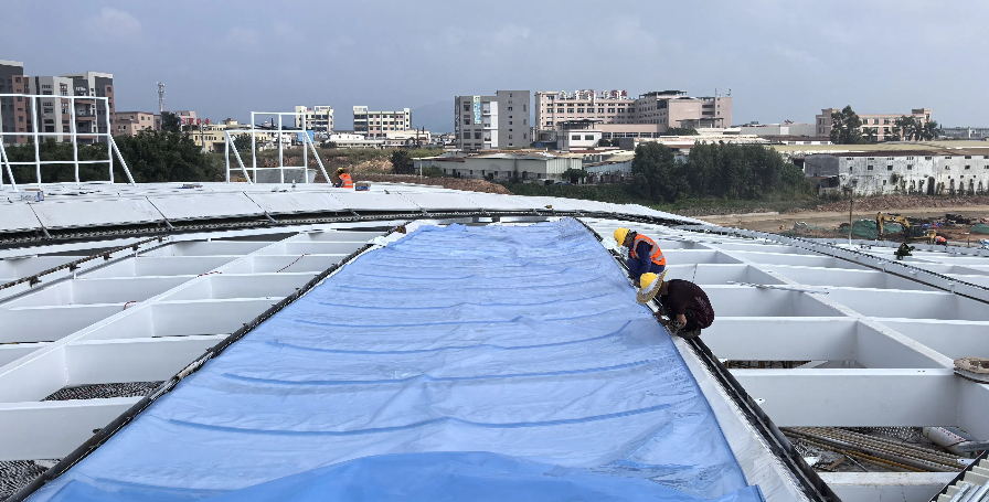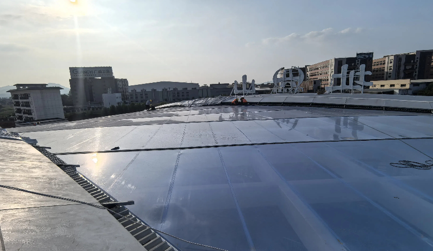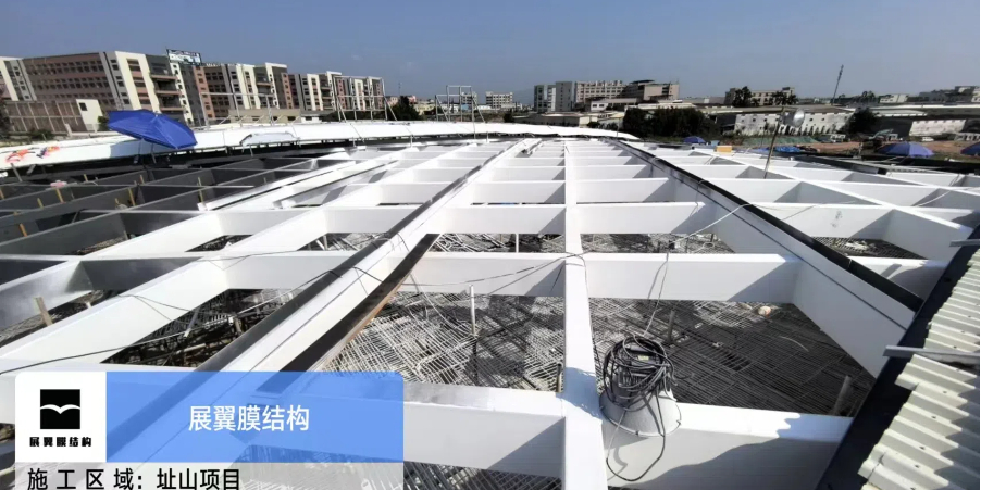 江門址山服務(wù)區(qū)ETFE膜結(jié)構(gòu)屋頂項目進(jìn)入緊張的施工階段,目前鋼結(jié)構(gòu)安裝完成,正在進(jìn)行膜材的安裝,工程面積逾3000平方米。