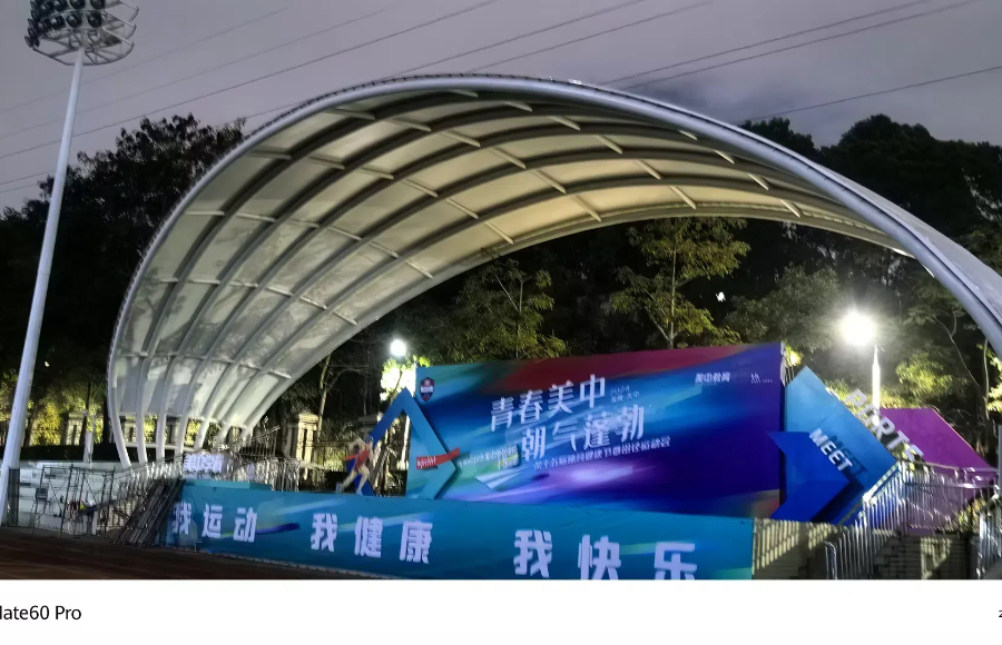 深圳美中學(xué)校主席臺(tái)張拉膜結(jié)構(gòu)工程完工,主席臺(tái)設(shè)計(jì)為拱形,鋼骨架作為支撐結(jié)構(gòu),覆蓋白色膜材,在燈光的搭配下更加美觀。