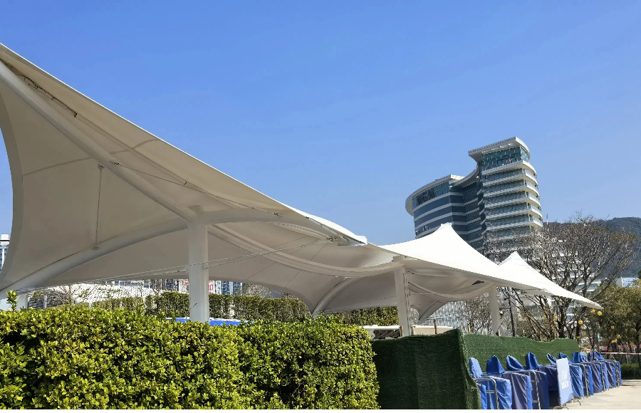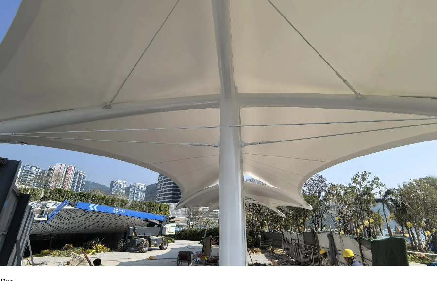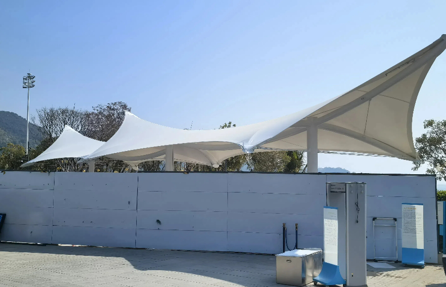 小梅沙海濱旅游中心出入口張拉膜頂棚工程正在施工當(dāng)中,現(xiàn)場看到設(shè)計為白色“飛燕”造型的頂棚已安裝完成,曲線邊界顯得張力十足,底下由鋼結(jié)構(gòu)及鋼索支撐,結(jié)構(gòu)穩(wěn)固耐用,適合海濱等場地。