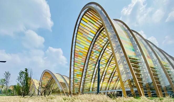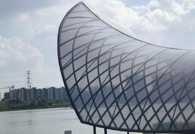 ETFE 膜材的優(yōu)點(diǎn):透光率高(透明膜材可達(dá)90%)、透光透景,色彩豐富(可以各種顏色,而且通過鍍點(diǎn)可以控制透光率和遮陽系數(shù)),柔韌性好,非常適合應(yīng)用于(氣枕式)充氣膜結(jié)構(gòu)形式,以及膜單元板塊面積較小的單層張拉膜。