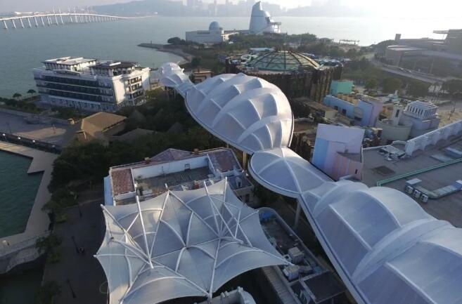 STFE 膜材的優(yōu)點(diǎn):覆膜的清晰度較好,可實(shí)現(xiàn)一定程度的透景。同時(shí),由于有織物基材提高了膜材強(qiáng)度,抗拉強(qiáng)度可達(dá)4000N/5cm。即使不加拉索,膜單元跨度一般在3m以上。
