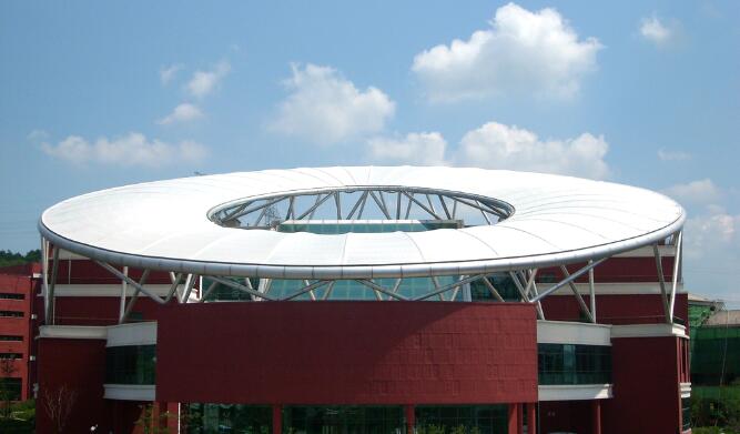 PTFE 網(wǎng)格覆膜的優(yōu)點(diǎn):玻璃纖維紗線編織工藝成熟,可定制高強(qiáng)度的織物基材,能夠達(dá)到G6等級(jí)。即使不加拉索,膜單元跨度一般可達(dá)5m左右。初始預(yù)張力高,張拉平整、外觀效果好,PTFE的耐久性、自潔性好。