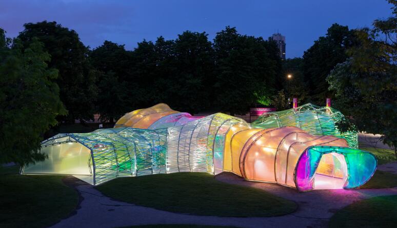 在非體育建筑上,ETFE也被廣泛應(yīng)用,最受關(guān)注的當(dāng)屬SelgasCano設(shè)計(jì)的2015蛇形畫(huà)廊,建筑師用了19種不同顏色的薄膜包裹了一個(gè)極簡(jiǎn)的鐵質(zhì)框架,來(lái)呈現(xiàn)一種萬(wàn)花筒的效果。另一個(gè)例子是KieranTimberlakeArchitects設(shè)計(jì)的倫敦美國(guó)大使館,ETFE的鰭狀凸起有助于建筑東西南三面的遮陽(yáng),同時(shí)增加進(jìn)光量并防止鳥(niǎo)類(lèi)誤撞。