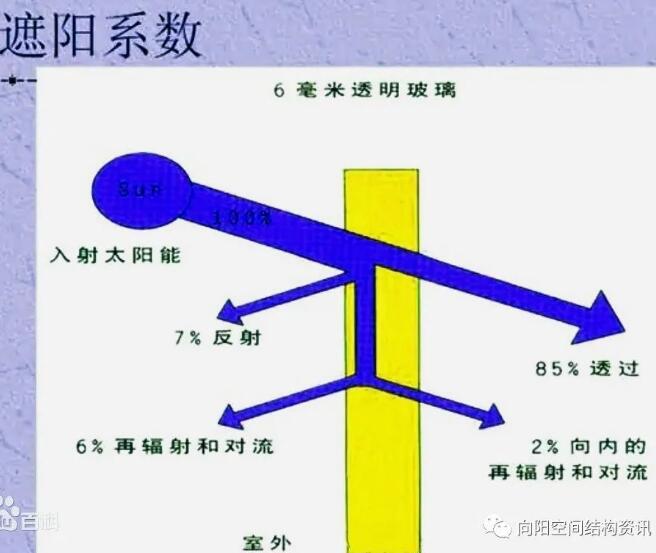 其二,某玻璃遮陽系數(shù)為0.5,不能認為玻璃能讓50%的太陽熱量進入室內(nèi),應理解為此玻璃能透過的太陽熱量是標準3mm白玻璃透過熱量的50%。