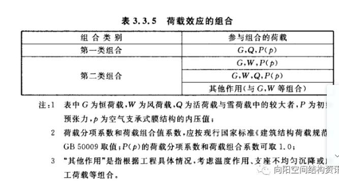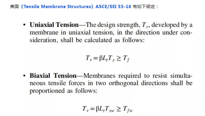 另外,美國規(guī)程不僅分別驗算了膜材經(jīng)向和緯向強度,還驗算了經(jīng)緯向的組合強度。但膜面的經(jīng)緯向應力一般不會同時最大,所以通常不是控制情況。
